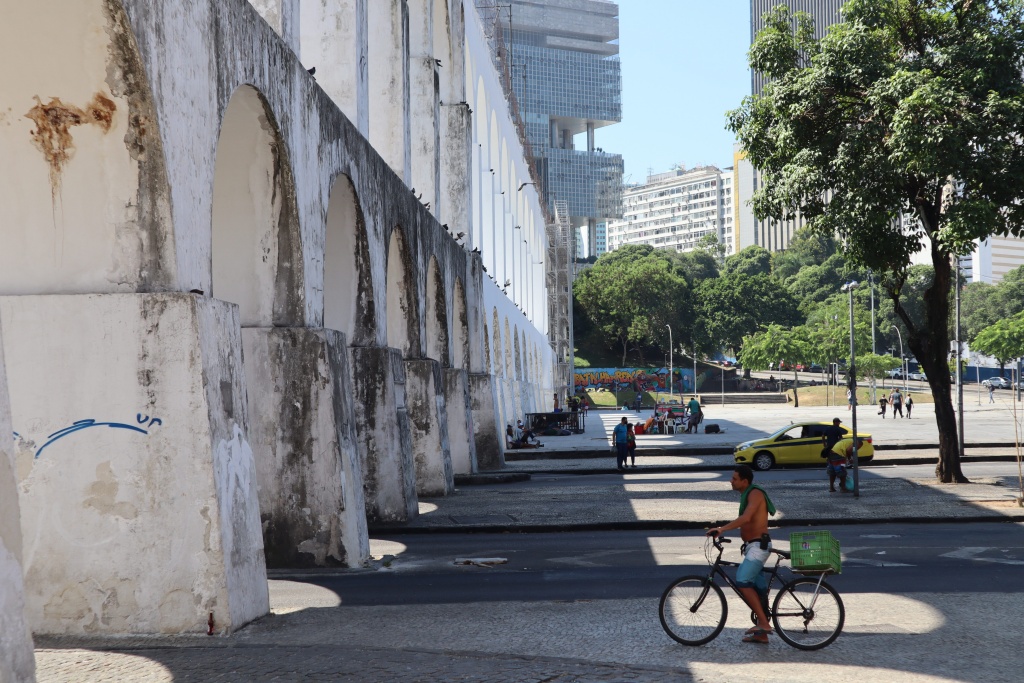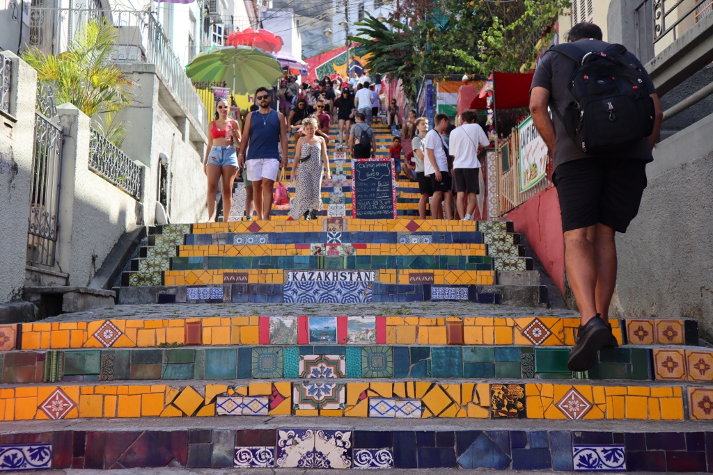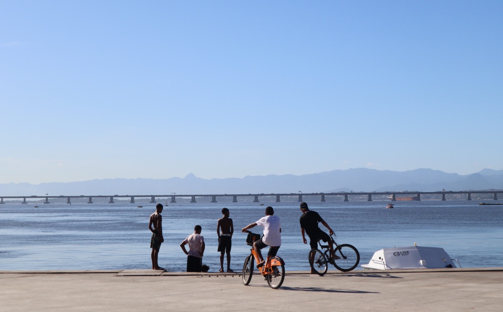 Pyöräilijä odottamassa vastaaantulevaa liikennettä – Rio de Janeiro, Brasilia.Turisteja Selaronin mosaiikkirappusissa – Rio de Janeiro, Brasilia.Kalastusta seuraavat teinipojat – Rio de Janeiro, Brasilia.