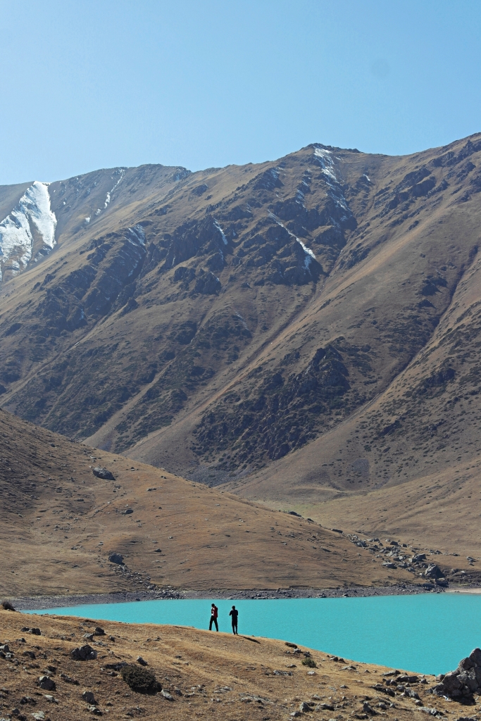 Miehet kiertämässä kirkkaan sinistä vuoristojärveä – Kol-Tor, Kirgisia.