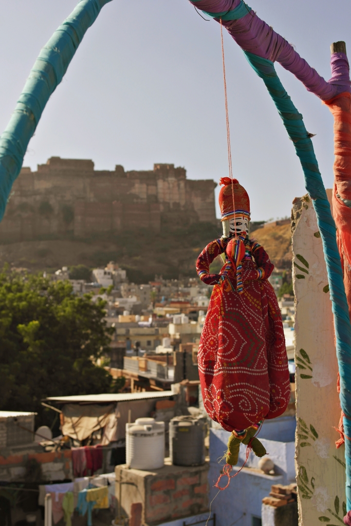 Hotellin katolta löytynyt nukke sekä näkymä kaupungin linnoitukselle – Jodhpur, Intia.