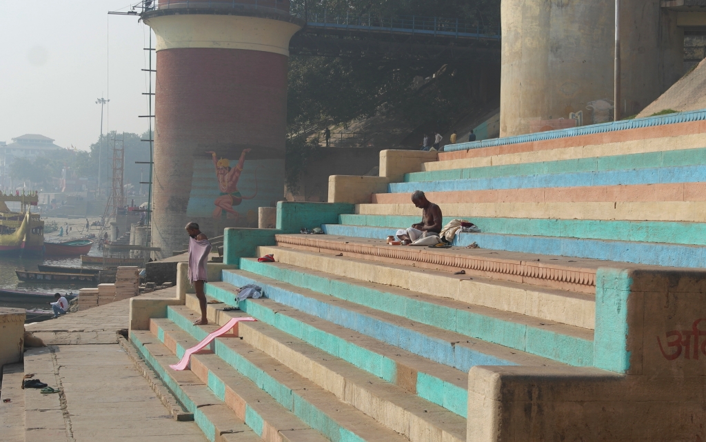 Miehet rukoilemassa ennen pyhään jokeen pulahtamista – Varanasi, Intia.